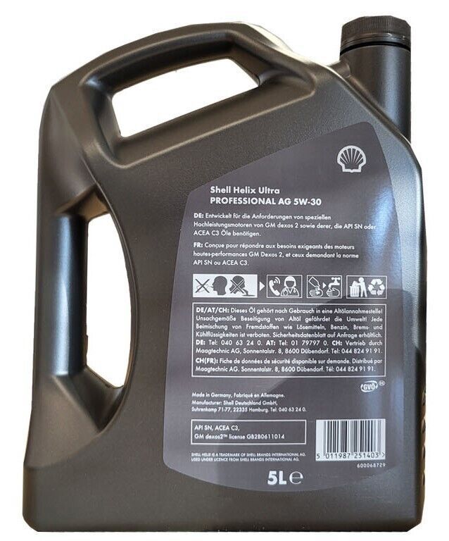 Shell Helix Ultra Professional AG 5W-30 ist ein Motorenöl auf Basis der Shell PurePlus Technology, entwickelt für moderne Benzin- und Dieselmotoren von General Motors sowie Opel/Vauxhall. Es bietet hohe Kraftstoffeffizienz, starken Verschleißschutz und zuverlässige Motorsauberkeit.